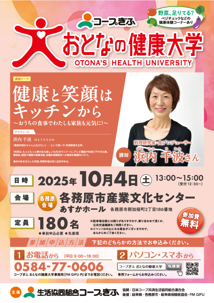 コープぎふ様は『おとなの健康大学』を開催され、運動、食生活、生活習慣の面で大人の健康づくりを応援されておられます。